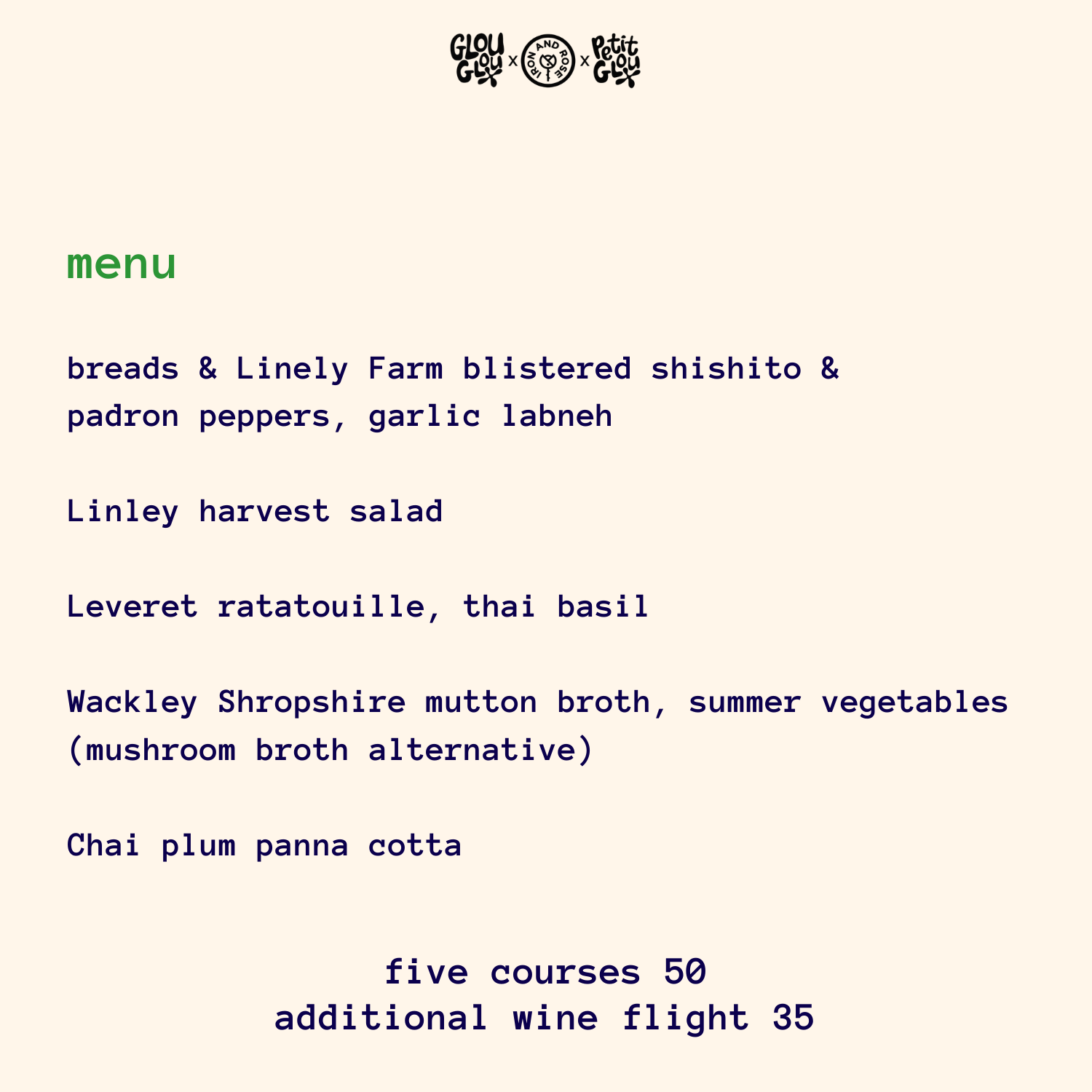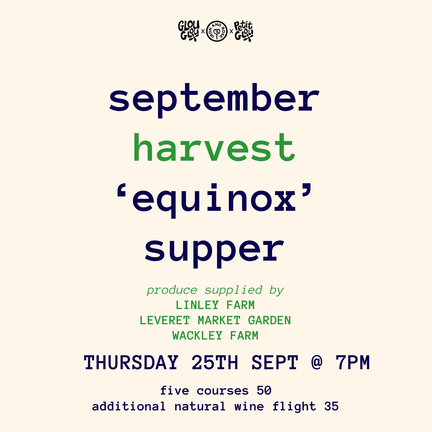 A Shropshire harvest supper championing local farms Wackley Farm, Leveret Market Garden & Linley Farm. In celebration of the harvest season enjoy five courses created with seasonal produce in mind by the GlouKitchen. Why not throw in a wine-flight? Five naturally delicious pairings poured alongside your supper, carefully curated by our Gloumellier Ruari.